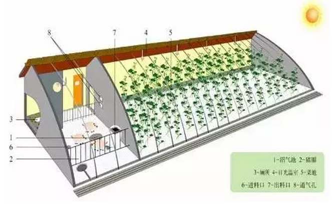 這種生態模式是依據生態學、生物學、經濟學、系統工程學原理,以土地資源為基礎,以太陽能顫動力,以沼氣為紐帶,進行綜合開發利用的種養生態模式。通過生物轉換技術,在同地塊土地上將節能日光溫室、沼氣池、畜禽舍、蔬菜生產等有機地結合在一起,形成一個產氣、積肥同步,種養并舉,能源、物流良性循環的能源生態系統工程。