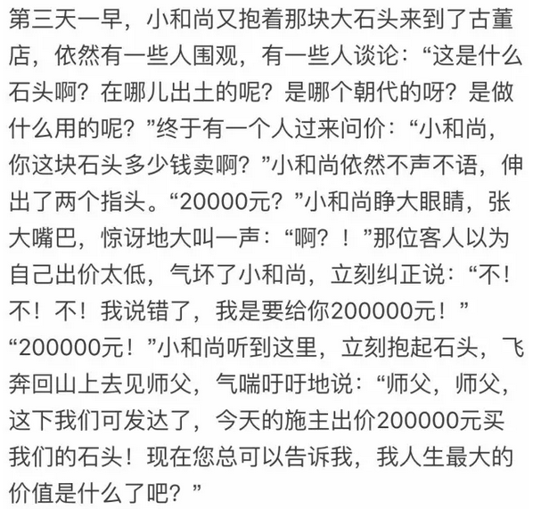 第二天早上,在博物館里,一群好奇的人圍觀,竊竊私語:“一塊普通的石頭,有什么價值擺在博物館里呢?”“既然這塊石頭擺在博物館里,那一定有它的價值,只是我們還不知道而已。”這時,有一個人從人群中竄出來,沖著小和尚大聲說:“小和尚,你這塊石頭多少錢賣啊?”小和尚沒出聲,伸出兩個指頭,那個人說:“200元?”小和尚搖了搖頭,那個人說:“2000元就2000元吧,剛好我要用它雕刻一尊神像。”小和尚聽到這里,倒退了一步,非常驚訝!