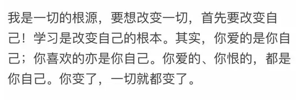 為什么一個老板再難,也不會輕言放棄,而一個員工做得不順就想逃走,為什么一對夫妻再吵再大矛盾,也不會輕易離婚,而一對情侶常為一些很小的事就分開了。說到底,你在一件事,一段關(guān)系上的投入多少,決定你能承受多大的壓力,能取得多大的成功,能堅守多長時間。 馮侖說,偉大都是熬出來的。為什么用熬,因為普通人承受不了的委屈你得承受,普通人需要別人理解安慰鼓勵,但你沒有,普通人用對抗消極指責(zé)來發(fā)泄情緒,但你必須看到愛和光,在任何事情上學(xué)會轉(zhuǎn)化消化,普通人需要一個肩膀在脆弱的時候靠一靠,而你就是別人依靠的肩膀。 孝莊對康熙說:孫兒,大清國最大的危機(jī)不是外面的千軍萬馬,最大的危難,在你自己的內(nèi)心。