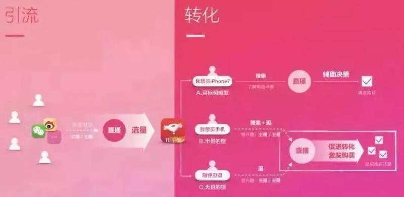 要將電商和直播這兩個不同的因素相結合,首先要找到兩者之間的連接點。電商需要人,那就要用直播吸引更多的人過來;商品要賣出去,那就用直播來賣更多的商品。這里我們從“引流”和“轉化”兩個點出發,對直播與電商的結合點進行了梳理。