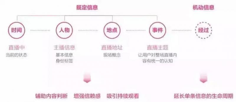 直播中傳遞的信息大致可以分為兩類:既定信息和實時信息。既定信息是本場直播客觀存在不會改變的,比如:主播、主題等;實時信息是主播在直播過程中實時產生的,比如:直播過程中大家都在問主播的身高體重,這類信息不一定屬于主題范疇,但一定是某一段時間大部分用戶關心的,并且隨著直播的進程,用戶關心的點會發生變化。所以,根據直播信息的特性,我們可以對既定信息進行固定展示,對實時信息進行機動展示(即在用戶關心的時段固定展示)。