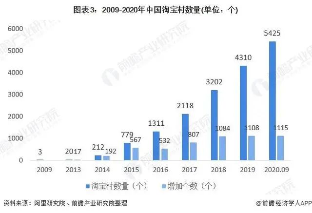 我國農(nóng)村電商的發(fā)展離不開淘寶村的貢獻(xiàn)。據(jù)阿里研究院發(fā)布的最新報(bào)告顯示,近年來我國淘寶村發(fā)展迅速。截止2020年9月,全國淘寶村數(shù)量已經(jīng)達(dá)到5425個(gè),較2019年全年新增1115個(gè),較2009年新增5422個(gè)。