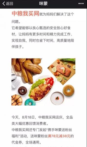 當天晚上的推送還預告了我買網將在兩天后的店慶日贈送大禮給咪蒙的粉絲,而在1當晚的文章中,大禮的謎底揭開,中糧送給每位咪蒙粉絲“滿78元減38元”的代金券。