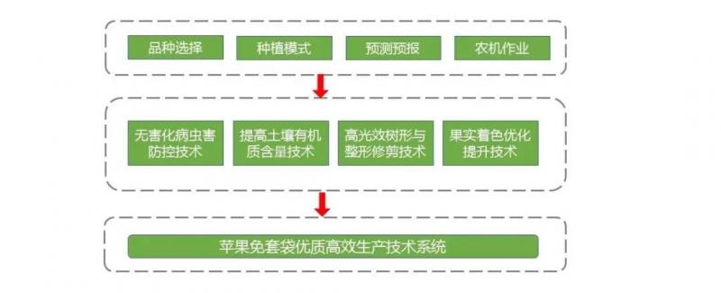 蘋果免套袋栽培主要病蟲害防控及果實外觀品質提升技術研究,以主要病蟲害預測預報為先導,農業、生物、生理防控為核心,進行精準藥劑防控,配套著色品種選擇、高光效樹形與整形修剪及提高土壤有機質含量,改善土壤理化性狀等技術,建立了蘋果免套袋栽培高效防控技術體系,使蟲果率維持在0.5%以下,病果率1.0%以下,果實外觀品質等同于套袋果,內在品質優于套袋果。