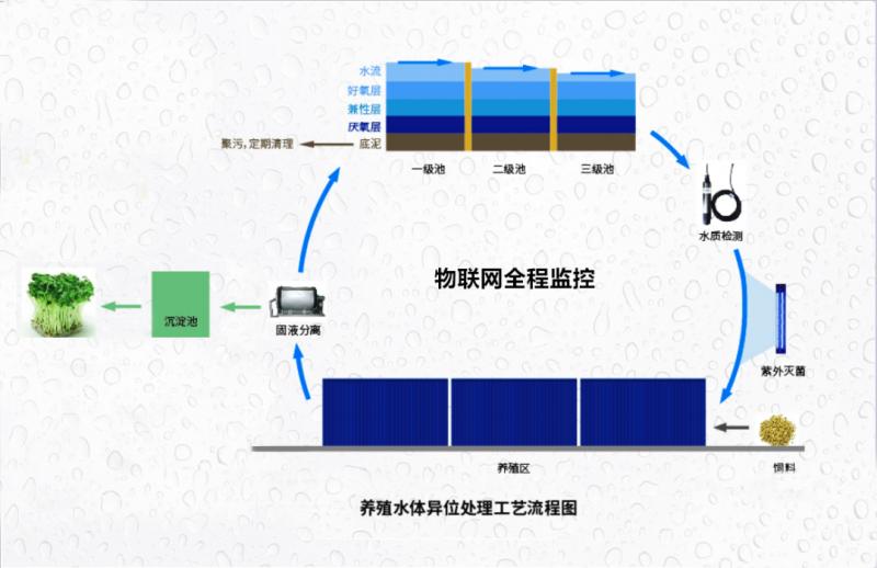 以生態池塘為依托,在岸基上搭建集裝箱養殖裝備進行循環養殖,通過與生態池塘進行水循環,實現養殖尾水凈化。配套物聯網控制系統,監控養殖全過程及水質變化、尾水處理效果等,實現養殖生產信息化管理。水循環的開端,先用水泵(浮臺式)將生態池塘上層富氧水不斷抽至集裝箱養殖設備中,并利用鼓風機曝氣提高箱內水體溶氧量,保障高密度集約化養殖。在箱體內模擬仿生態環流,保持最優流速,促進魚健康生長和品質提升。養殖產生的尾水,經斜面集污槽排出箱外,保持箱內水質清潔。養殖尾水排出箱后,經固液分離裝置過濾(120目篩網,去除90%以上大顆粒雜質),分離出的殘餌糞便可作為有機肥料;過濾后的水流入多級生態池塘,進行尾水凈化。養魚過程不接觸池塘底泥,避免了土腥味,有效提升了水產品品質。整個養殖過程不再向池塘中投喂飼料,池塘底質不會變臟變臭,可實現水體循環使用,池塘從養殖功能轉變為生態濕地功能,實現了傳統養殖向休閑漁業、觀光農業的轉型發展。
