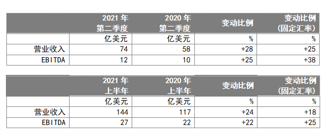 集團2021年上半年營業(yè)收入累計達144億美元,同比增長24%(增速按固定匯率計算為18%)。上半年EBITDA達27億美元,同比增長22%(增速按固定匯率計算為25%)。