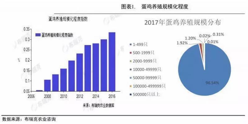 長期以來我國蛋雞養殖基本是存欄在500只以下的小規模養殖為主,近年來蛋雞養殖規?;潭扔兴嵘?,但小規模養殖占比仍在96%以上,萬羽以上大型蛋雞養殖場近占0.34%。蛋雞養殖高度分散,管理粗放,但從趨勢上看,養殖散戶數量逐漸減少,大型養殖場增加,中等規模養殖場數量較為穩定。