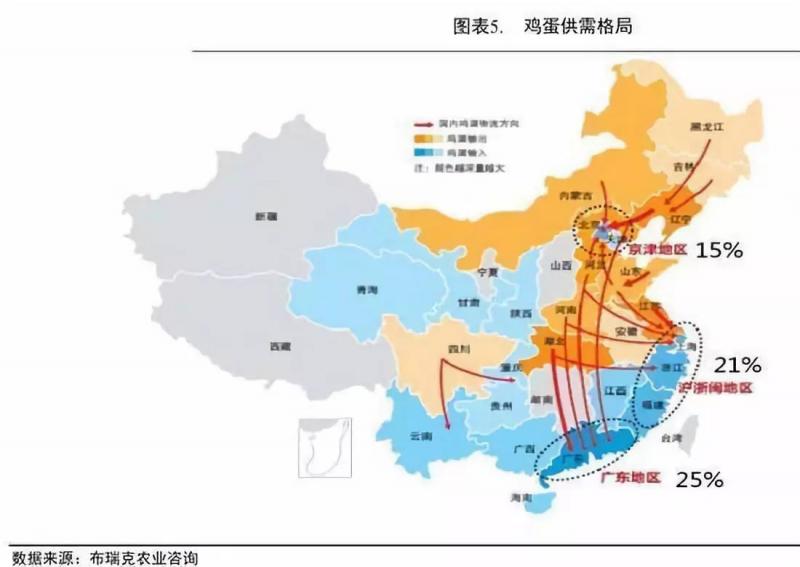 雞蛋物流流向較為明晰,可以簡單概括為從產量較大的華北、東北等地區流向東南、華南地區以及北京、天津、上海等大城市。根據數據測算,雞蛋流出量較大的省份包括河北(約178萬噸)、河南(約169萬噸)、遼寧(約134萬噸)、山東(約83萬噸)等省。供需缺口最大的是廣東省,每年流入量約為162萬噸,其次為上海(約75萬噸)、浙江(約64萬噸)、北京(約51萬噸)等地,其他絕大部分省份總體上處于供求平衡狀態。比較特別的流向是大連流向青島周邊,東北紅蛋河北粉蛋流向廣東福建,雞蛋物流走綠色通道不收高速費,各個地區物流都很發達,雞蛋期貨上市后報價體系透明,各地報價差價多是物流+固定費用,比如銷區漲價產區自然跟漲,反之亦然。