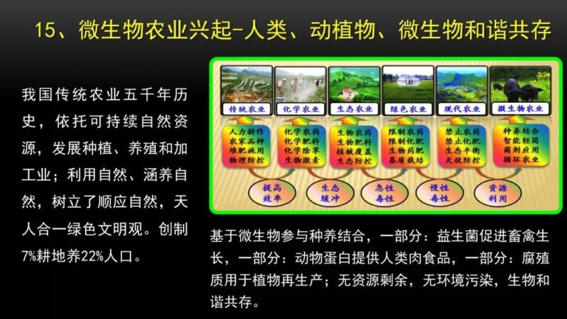 我國傳統農業,已經發展了5000年的歷史,依托可持續的自然資源,發展種植業、養殖業、加工業,利用自然涵養自然。已經樹立了一個很好的理念,自然和諧,天人合一,這樣一個綠色文明觀。創造了一個奇跡,我們用7%的耕地,養活了世界人口的22%。近百年來農業發展非常快,從傳統農業發展到了化學農業,接著到生態農業,接著到綠色農業,接著到現代農業,一個嶄新的農業新時代,已經到來了叫做微生物農業。我們的發酵床研究,是微生物里農業里面的一個典型,它是基于微生物參與的,種養結合的一個農業形態。