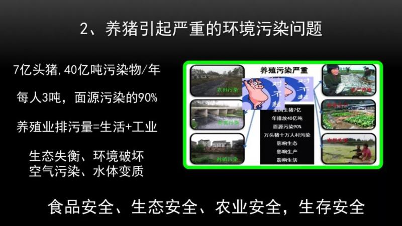 現在在農村我們還有1.4億的農民,靠養殖收入,你要養殖業不行了可不行,所以說對豬肉這么關心,是因為它已經成為中國人不可替代的肉食品。養豬引起嚴重的環境問題, 7億頭的豬每年要排40億噸的污染,相當于每一個人平均受到三噸的豬糞的污染。養殖污染已經占到農業面源污染,也就是大范圍的污染的85%到90%,這個污染相當于我們生活污水和工業污水的總和。所以它會引發很多問題,你比如說生態失衡問題,環境污染問題,空氣污染問題,水體變質問題。這些問題又會導致很多安全問題,比如說食品安全,生態安全,農業安全,甚至威脅到生存安全。