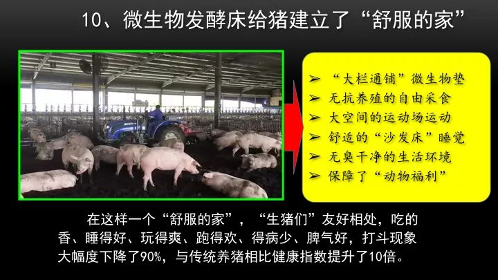 微生物發酵床養豬,環保又高效,我們跟中農院的科學家們一起,用組學方法,用遠程監控的方法,揭示微生物發酵床的作用機理,在這樣一個豬欄里面存放4500頭豬,那么它的光、溫、水、濕、飼料和喝的水,全部自動化,用機械翻耕,所以一個人一年可以管1萬頭豬,是世界上,養豬效率最高的一種方法。整個過程沒有污染,沒有臭味,沒有蠅蟲,形成的智能、衛生、清潔、環保、高效的這么一個零排放養豬系統。同時生產出優質的豬肉,生產出大批的有機肥,給我們帶來了很多效益。那么微生物發酵床,它具有無臭消納豬糞的能力,豬把糞一拉到發酵床的墊料上面,墊料會迅速的將臭味吸附到墊料里面去,接著微生物開始工作,慢慢地一步一步把臭味消納掉。