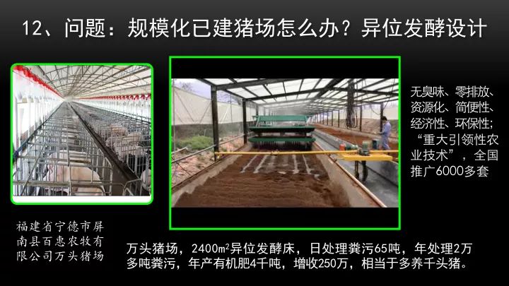 我們的一位朋友在福建寧德,他做了一個很現代化的養殖場,希望用發酵床來做污染治理。豬舍已經建好了,我怎么辦呢?我們想了一個辦法,給他設計了一個異位發酵床,就在原來豬舍的邊上,做一個發酵床,把豬糞的引到發酵床里面去,進行無臭處理。他的兩三萬頭的豬場,我們做了一個2000多平方米的異位發酵床,一年能夠處理2萬多噸的豬糞,沒有排放,也沒臭味解決了問題。