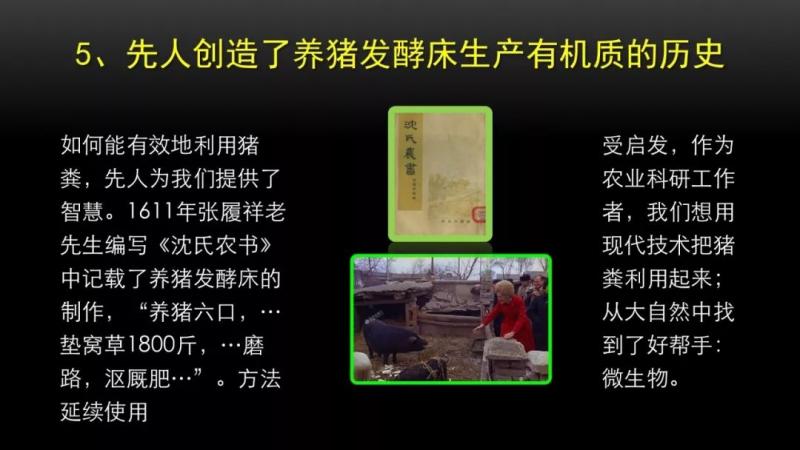 最后我想說,養豬的問題,你把觀念改變了就不是問題,養豬為了豬糞,生產腐殖質,解決農業的有機質問題,又解決環保問題,順帶產生豬肉,你看這個效益好不好。用了這種方法養豬,環保解決了,你養豬就不成問題了;看病解決了,你可以放心的養豬;效率提高了,一個人可以養1萬頭豬,不要依賴進口了。這樣我們就不用擔心,養豬污染環境,我們就不用擔心農田缺乏有機肥,我們也再不用擔心,豬肉供應了。