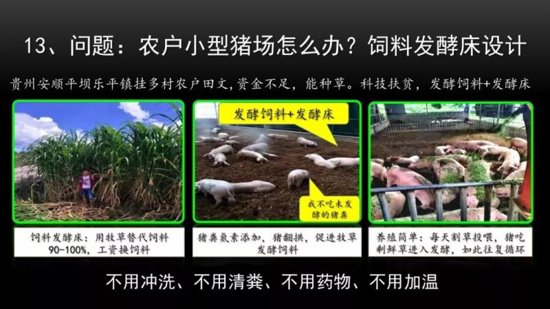 問題又來了,我們貴州的一位農民,在網絡上看到發酵床養豬很好,他到我們農科院來找到我們,他說我們那邊比較窮,是一個貧困村,資金不很足,但是我們會種草,有沒有辦法做發酵床?我們把他這個問題,拿來研究完以后,給他設計了一個叫做飼料發酵床。就把發酵飼料跟發酵床,有機地結合在一起,用種草把草粉碎完以后,做墊料墊在豬舍里面,豬養在上面,豬糞拉到發酵飼料上面來,我們科學上講是氮素添加,能夠促進發酵飼料的發酵。