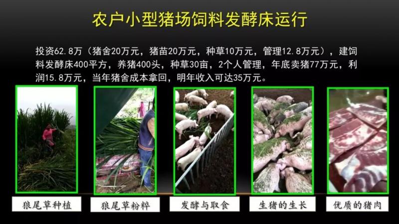 大家就問了,豬會不會吃豬糞?我們研究過豬的行為,豬是不會吃自己,沒有發酵過的豬糞,發酵過以后它就不是豬糞,變成一個氮素的物質。整個試驗完以后,非常簡單,這個農戶開頭先做成一個發酵床,墊到豬舍里面去,只要種草,每天把草割回來,鮮草扔到豬舍里面去,豬就吃鮮草,配發酵床的發酵飼料,吃剩的鮮草再進入發酵床,就這么循環。不用沖洗,不用清糞,不用藥物,不用加溫,貴州那邊冬天還有點冷,他們覺得很好。這一對夫妻那年投了62萬,做了一個豬欄22萬,種草,養豬,還有管理等等。做了一個400平方米的豬舍,養了400頭豬,到年底賣掉以后,賺回77萬元,利潤15.2萬。這15.2萬是什么意思,連豬舍的老本都拿回來了,他明年要做下去的話,可以做到35萬的利潤。