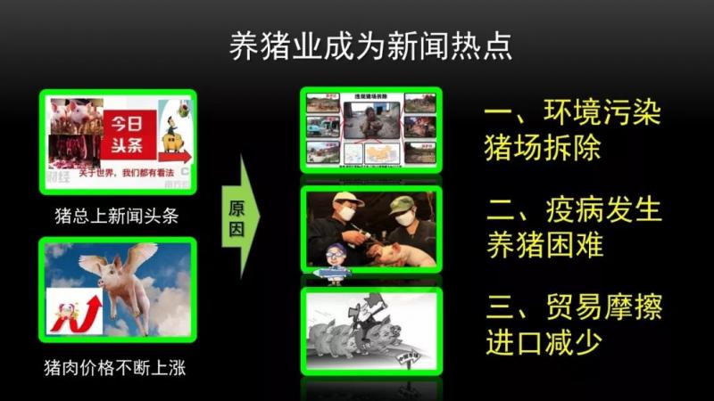 最近大家都知道豬的問題,經常上頭條,豬肉一直漲價,關系到整個百姓的生活,什么原因呢?我給大家簡單分析一下,大概三個事:一個你養豬污染環境,被拆了很多豬場,這是之前的事;另一個最近疫病發生很嚴重,養豬越來越難;還有大家知道的原因,貿易摩擦,豬肉進口也少了。