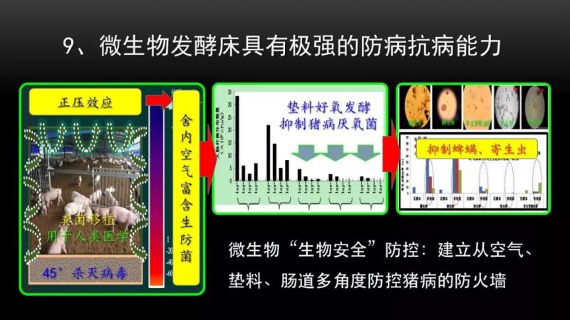 發酵床還有很強的防病抗病能力,大家知道養豬其實最頭痛的,還不是環保,最頭疼的是病害。發酵床有這個能力,首先是發酵床內部的空間的溫度要比外面高一點點,形成一個正壓效應,所以可以阻擋外面外來空氣帶來的病源,接著發酵床本身具有一個叫做糞菌移植的機制。在這個機制在里面,一個發酵床,你只要養上一次健康的豬,豬就能夠利用豬糞,把健康腸道的微生物菌群排到墊料上面,經過擴增,移植到下一代的豬群里面去,來促進豬的健康。