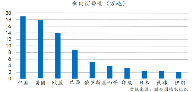 根據2019年世界糧農組織預測美國、中國和巴西禽肉產量分別為2260萬噸、2040萬噸和1420萬噸,中國已成為繼美國之后世界第二大雞肉生產國。