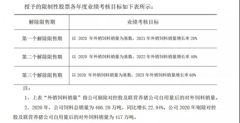 按照三個解除限售期,大北農(nóng)設(shè)置了三個業(yè)績考核期,即2021年至2023年,以2020年大北農(nóng)外銷飼料銷量為基數(shù)分別增長20%、40%和60%。