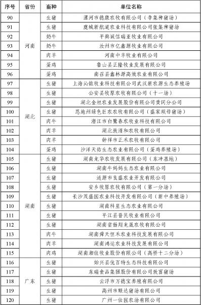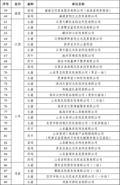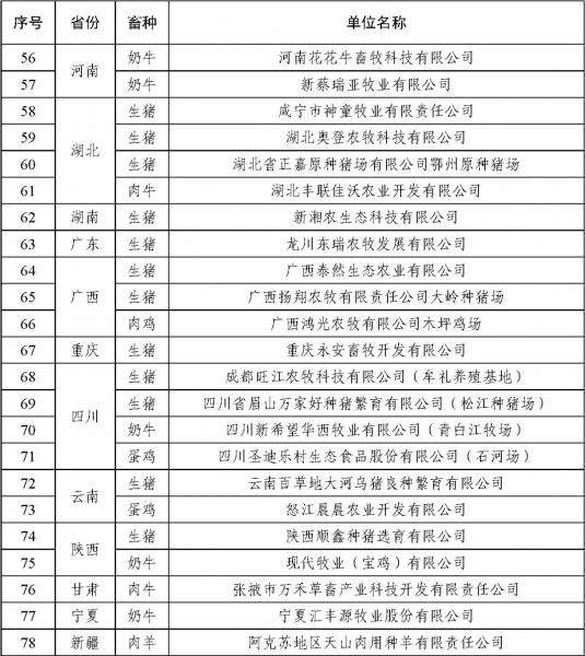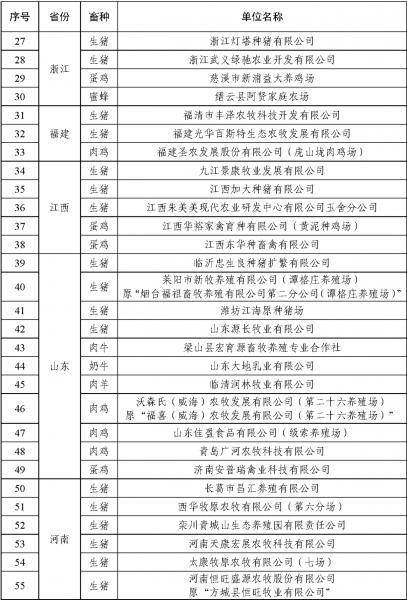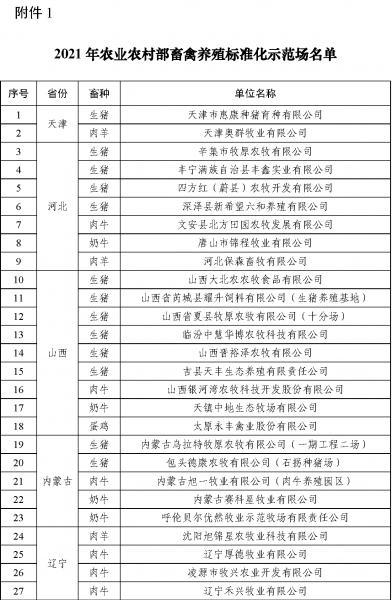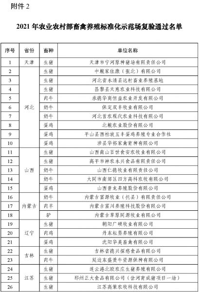按照《農(nóng)業(yè)農(nóng)村部辦公廳關于開展2021年畜禽養(yǎng)殖標準化示范創(chuàng)建活動的通知》(農(nóng)辦牧﹝2021﹞20號),農(nóng)業(yè)農(nóng)村部組織開展了2021年畜禽養(yǎng)殖標準化示范創(chuàng)建活動,并要求地方對2018年度正式公布、2021年底到期并有意愿繼續(xù)創(chuàng)建的示范場進行了現(xiàn)場復驗。經(jīng)養(yǎng)殖場自愿申請、省級遴選推薦、部級專家評審和網(wǎng)上公示,現(xiàn)確定天津市惠康種豬育種有限公司等193家畜禽養(yǎng)殖場為2021年農(nóng)業(yè)農(nóng)村部畜禽養(yǎng)殖標準化示范場。經(jīng)現(xiàn)場審核,天津市寧河原種豬場有限責任公司等78家養(yǎng)殖場通過復驗,一并予以公布。