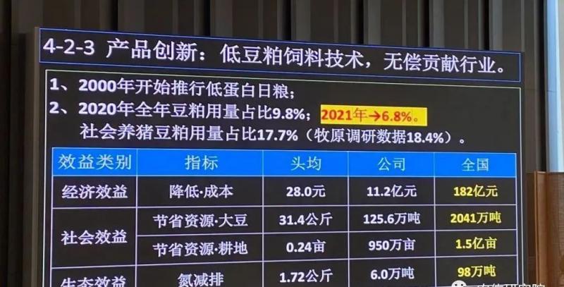 如果我們技術全國推廣,非常大的價值是 182 億,關鍵是我們能夠節省大豆進口2000萬噸,對應是1.5億畝的土地。特別是去年我們費了九牛二虎之力也才增加了 2800 萬畝的大豆種植,和我們的消費端直接省下了 2000 萬噸對應的 1.5 億畝——就對我們當今社會貢獻太大。所以在去年我們就把整個技術無償的貢獻給行業。去年年底我有給領導們又督促,我說領導要大力推廣。我們 2021 年 12 月 25 號我們結賬,我的豆粕用量降到了6.8%,和我們專家們的推廣的標準相差一倍。我說這個沒問題,我們基本上都這樣做。也就是說這個產品創新不僅僅是一個成本問題,關系到社會、經濟、政治甚至穩定的問題,價值非常大。