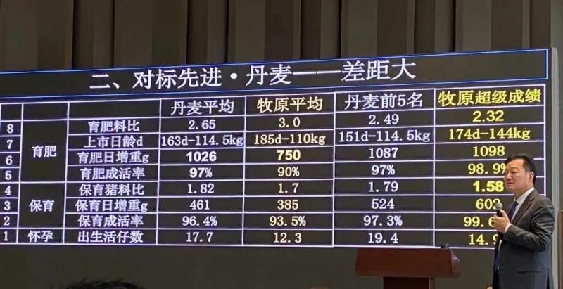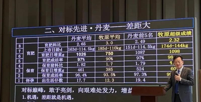 各位,其實我們現在就是作為一個企業,我們一定要對標我們人類文明的最高峰最高點,這才是我們要做的。如果看看丹麥最好成績,看看牧原最好成績,我們也不是那么矬,還有機會。其實我們也養出了和丹麥成績差不多,甚至還要好一點的成績。(數據對比請看圖,此處秦總口述略過)