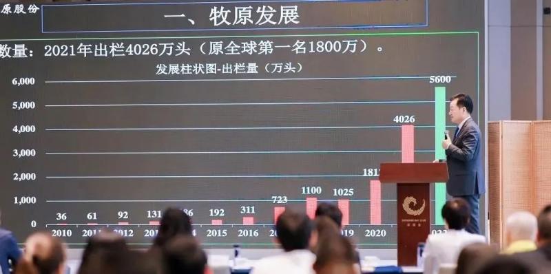 今天是我們站在行業外來看待生豬行業和企業的發展。牧原發展,經歷了這 24 個省,102個市,215個縣,還有現在有 230 家子公司,1183個廠。經過了這30 年的發展,我們現在的出欄量每年都是一個近乎 50% 以上的增長,特別是到了2019年一千萬頭,在2019年發生非洲豬瘟的這個情況下,(2020年)到 1800萬頭,這個已經到了世界第一了。那么到去年達到了 4000 萬,反而是在非瘟之下增長這個勢頭沒有減弱。那么2022年能達到 5600萬頭左右,未來發展還有一個比較好的勢頭。另外我們的發展不是當年留下來的,都是幾年前準備的,到目前只是一個表達而已。