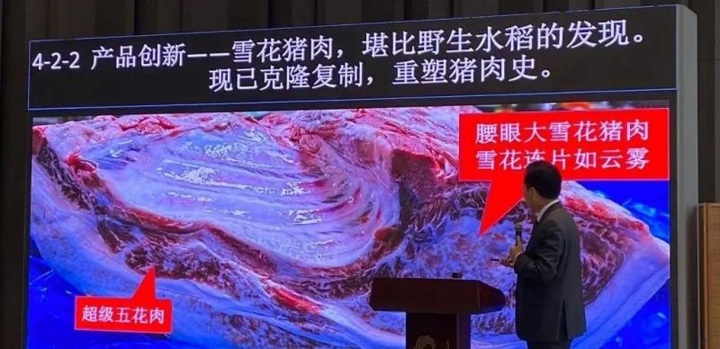更關鍵的是我們培育了雪花豬肉這個發現堪比野生水稻的發現。我們這個現在已經克隆復制了。那么這些豬肉就說是像這些地方大家能看到是五花肉,這里脊本身是紅紅的,結果是不是像雪花一樣,非常像大理石紋。那么這些是我們過去想都不敢想的。那么這些豬肉的脂肪含量香得很。這是個后腿肉。我們原來豬的后腿肉都很紅,現在后腿肉都像石頭一樣有大理石紋——白的都是吃的香的嫩的那個脂肪。