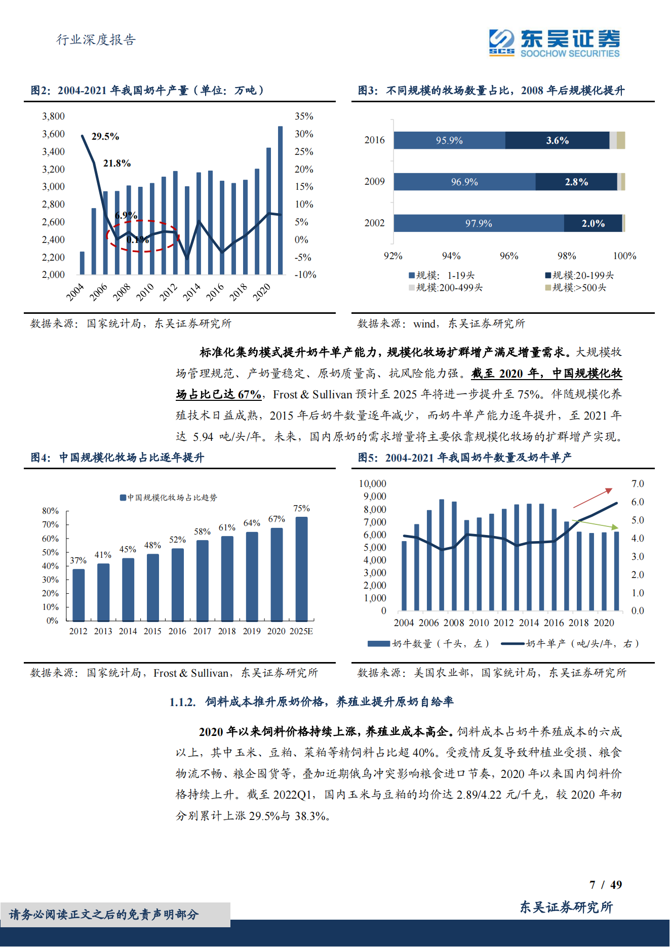 東吳證券研究所發布的《飲料乳品行業深度報告》顯示,上游受2008年三聚氰胺事件影響,一批小型養殖戶破產退出,規模化程度提升。截至2020年,中國規模化牧場占比已達67%,Frost & Sullivan 預計至2025年將進一步提升至75%。伴隨規模化養殖技術日益成熟,2015年后奶牛數量逐年減少,而奶牛單產能力逐年提升,至2021年達5.94噸/頭/年。未來,國內原奶的需求增量將主要依靠規模化牧場的擴群增產實現。
