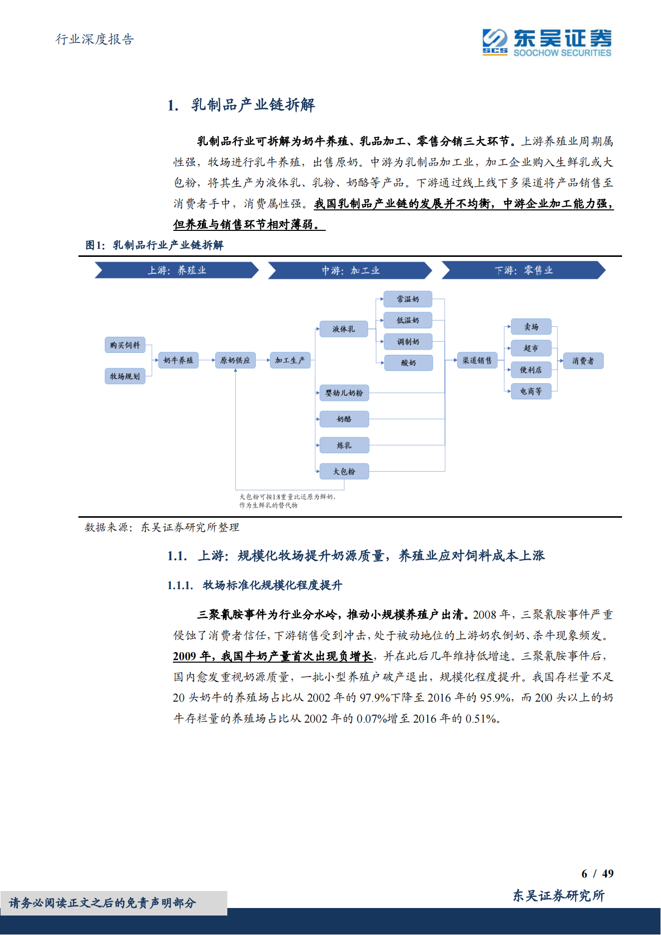乳制品行業是一個超6000億規模的大行業,可拆解為奶牛養殖、乳品加工、零售分銷三大環節。上游養殖業周期屬性強,牧場進行乳牛養殖,出售原奶。中游為乳制品加工業,加工企業購入生鮮乳或大包粉,將其生產為液體乳、乳粉、奶酪等產品。下游通過線上線下多渠道將產品銷售至消費者手中,消費屬性強。我國乳制品產業鏈的發展并不均衡,中游企業加工能力強,但養殖與銷售環節相對薄弱。