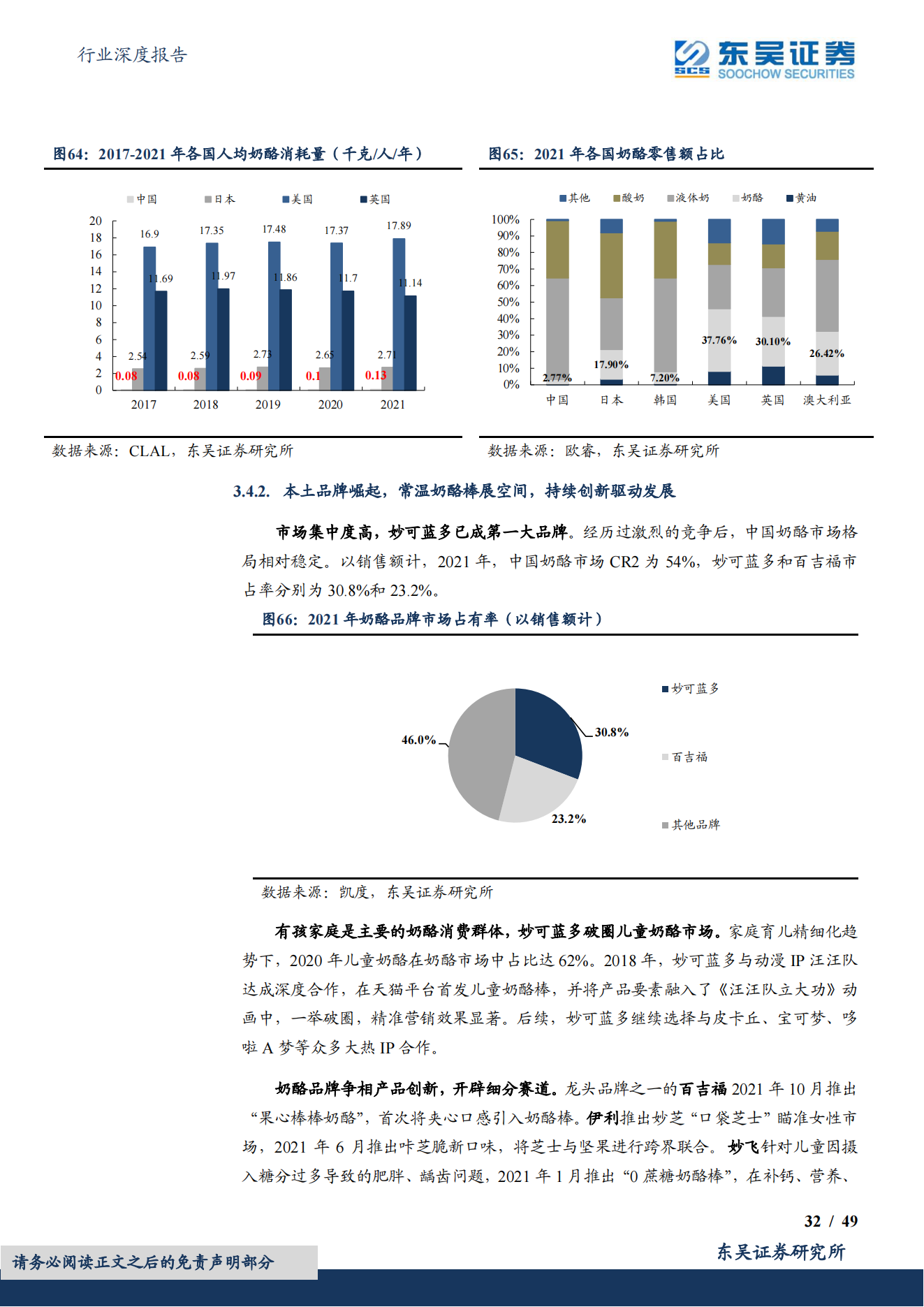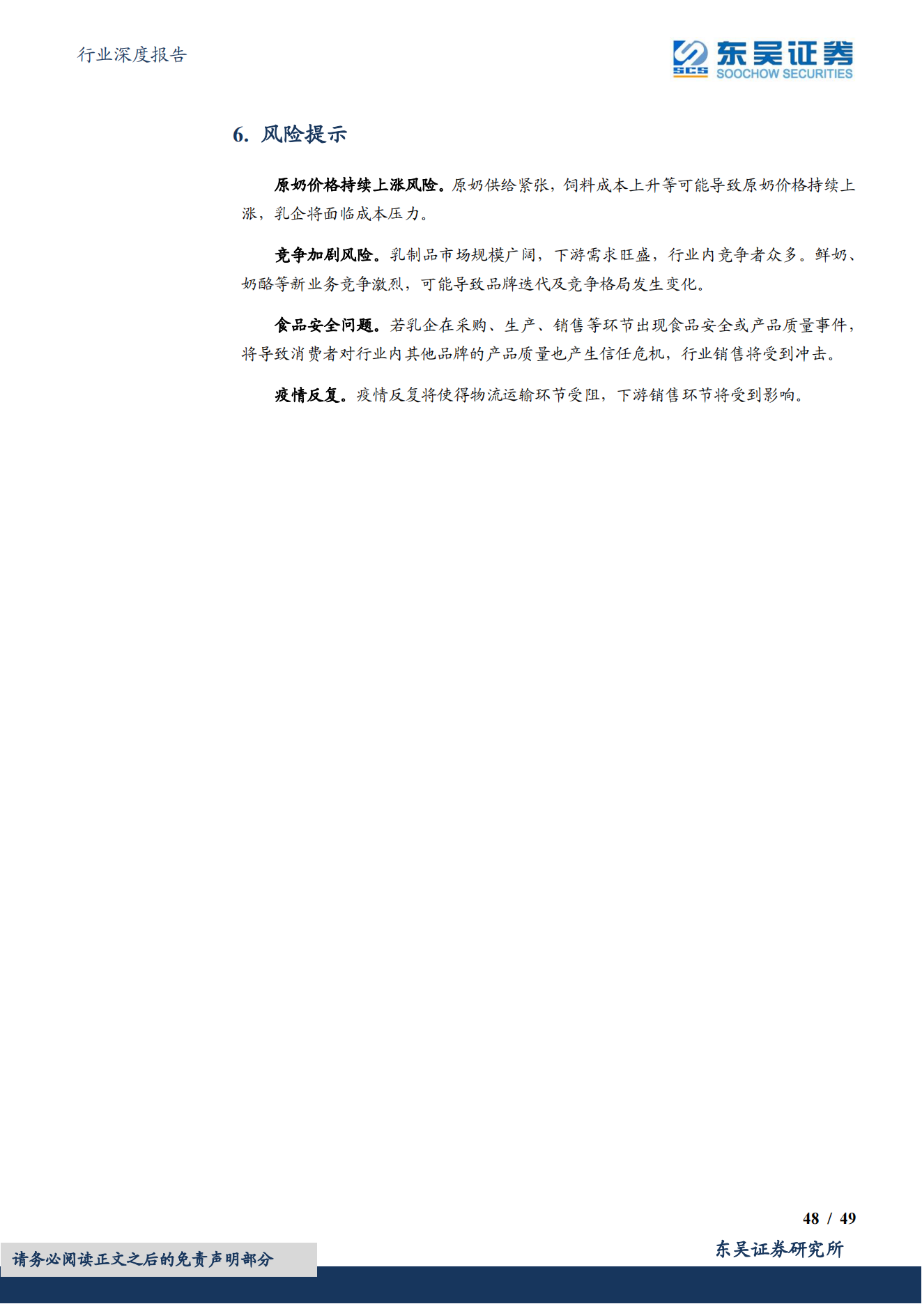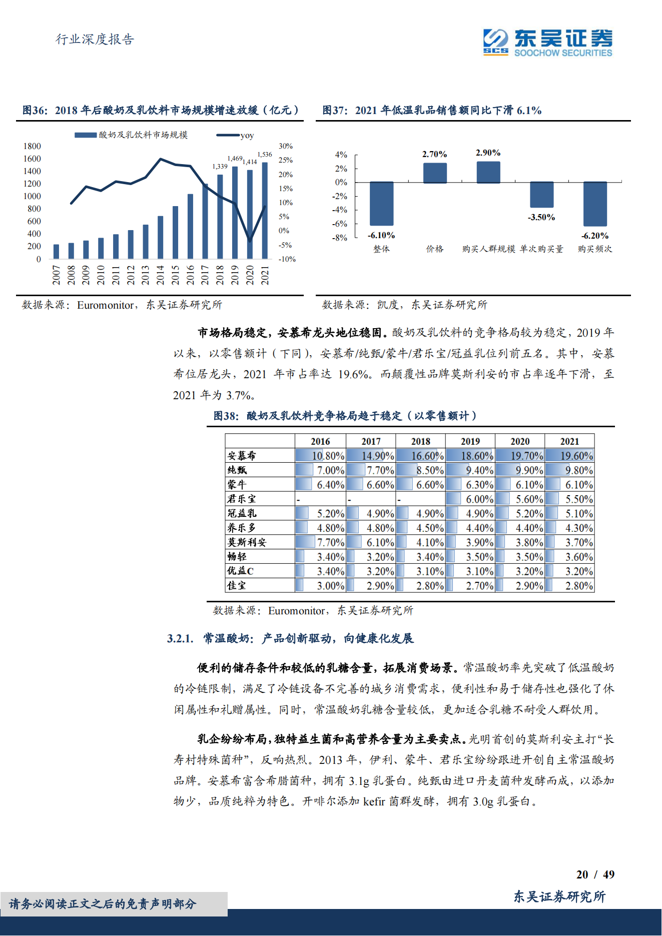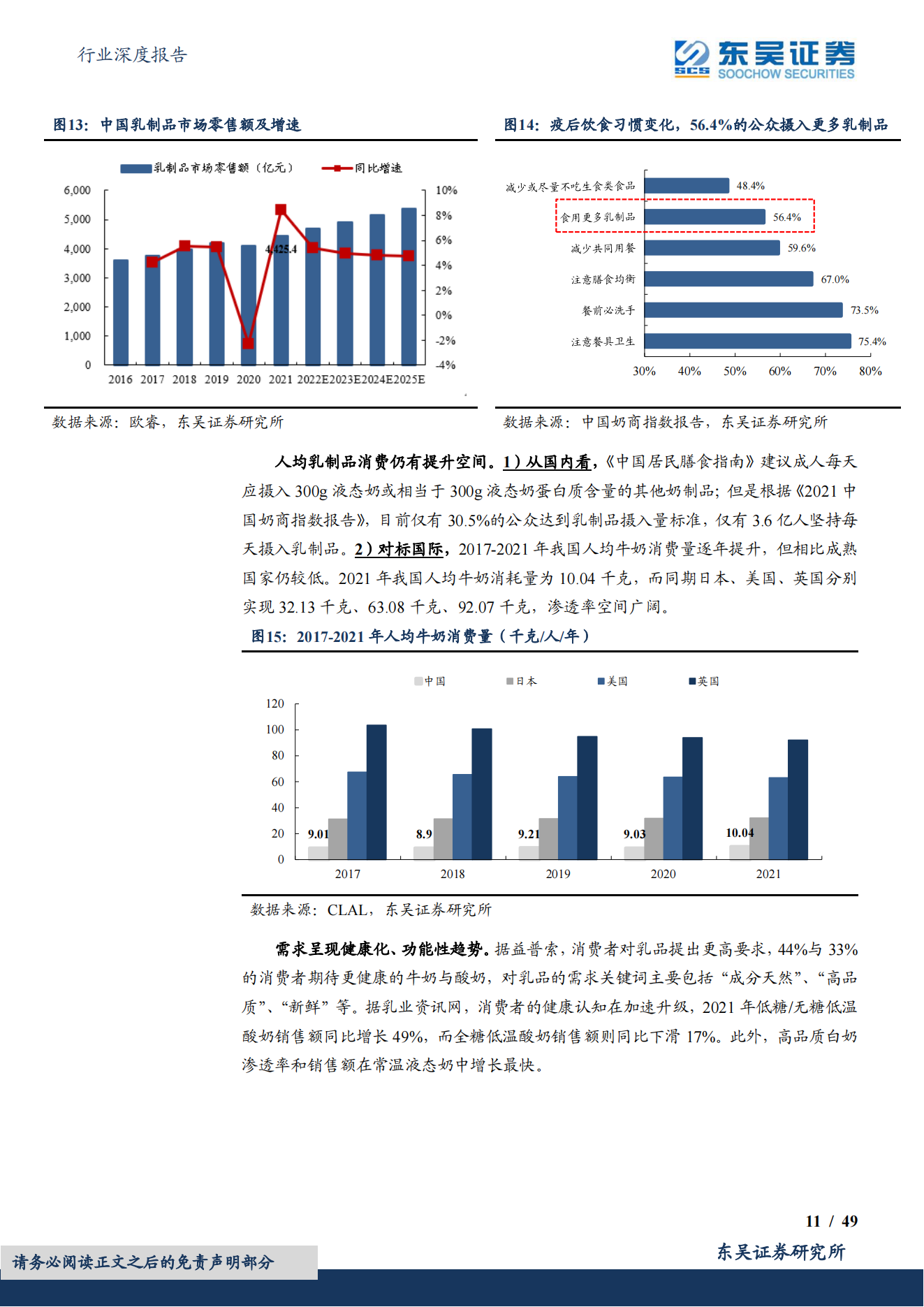 下游乳制品零售額增長穩健,疫后飲奶意識提升。2016-2021 年,中國乳制品零售額的年均復合增速為4.2%,至2021年實現4425億元。據《2020中國奶商指數報告》,疫后民眾健康意識提高,乳制品提升免疫力成為共識。疫情期間56.4%的公眾增加了乳制品攝入量。伴隨飲奶意識及飲奶人群滲透率提升,歐睿預計至2024年我國乳制品零售額將突破5000億元。