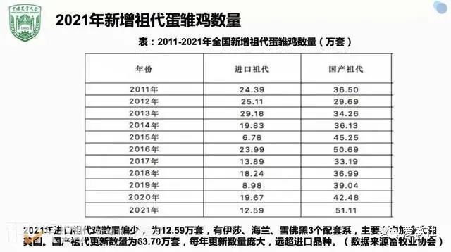 而隨著國內蛋雞產業的迅猛發展,我國蛋雞種業自主創新和良種推廣能力顯著增強,對進口雞的依賴度正在下降。寧中華表示,從近十年祖代雛雞的數量變化可知,國產祖代每年的更新數量龐大且保持較高的增幅;與之相反的是進口祖代數量偏少,在新增祖代蛋雛雞中的占比不斷降低。
