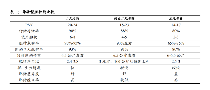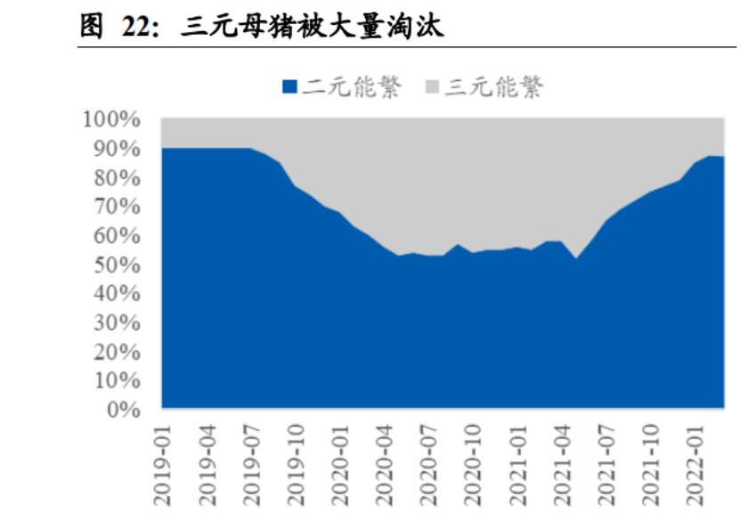 大量回交二元和三元母豬用于填補(bǔ)產(chǎn)能缺口。2018 年爆發(fā)的非洲豬瘟對(duì)于生豬產(chǎn)能 削減的規(guī)模空前——能繁母豬存欄于 2019 年 9 月跌至最低谷的 2631 萬頭,較疫情 發(fā)生前高點(diǎn) 4700 萬頭,下降約 44%。并且不僅父母代存欄驟減,祖代甚至曾祖代 存欄均受到明顯影響。這就導(dǎo)致了如果按照正常的補(bǔ)欄方式,相當(dāng)長(zhǎng)的時(shí)期內(nèi)生豬 缺口都無法填補(bǔ)。為了盡快補(bǔ)充父母代母豬,養(yǎng)殖戶只能選擇用回交二元母豬(二 元母豬與純種大白/長(zhǎng)白公豬配種所生)和三元母豬(原本商品代母豬轉(zhuǎn)而作為父母 代母豬使用)進(jìn)行替代。