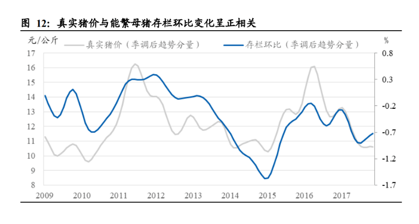 豬價(jià)走向決定產(chǎn)能增減。我們通過實(shí)證發(fā)現(xiàn)——真實(shí)豬價(jià)經(jīng)季調(diào)后的趨勢(shì)分量與能 繁母豬存欄環(huán)比變化經(jīng)季調(diào)后的趨勢(shì)分量呈現(xiàn)高度正相關(guān),即行業(yè)產(chǎn)能的變化趨勢(shì) 與豬價(jià)走向密切相關(guān),這與我們豬周期楔形區(qū)間波動(dòng)模型的假設(shè)相符。同時(shí),我們 也注意到能繁母豬存欄環(huán)比變化的中樞位于 0 線以下,這意味著行業(yè)所需能繁母豬 數(shù)量是在逐漸減少的。這是因?yàn)樾袠I(yè)養(yǎng)殖技術(shù)持續(xù)進(jìn)步,而豬肉需求量基本維持穩(wěn) 定,母豬產(chǎn)仔效率的提升降低了對(duì)母豬數(shù)量的要求。因此,只有當(dāng)存欄降幅大于母 豬產(chǎn)仔效率提升的程度,行業(yè)產(chǎn)能才能得到實(shí)際去化。
