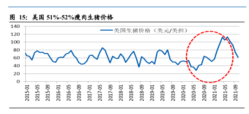 2020 年美國(guó)豬場(chǎng)大量破產(chǎn),隨后一年豬價(jià)出現(xiàn)暴漲。雖然我國(guó)養(yǎng)豬行業(yè)歷史上尚未 發(fā)生過如此慘烈的行業(yè)大面積破產(chǎn)情況,但美國(guó)生豬養(yǎng)殖行業(yè)卻剛剛經(jīng)歷一場(chǎng)腥風(fēng) 血雨。受到新冠疫情影響,2020 年 6 月美國(guó) 51%-52%瘦肉生豬價(jià)格跌至 28.45 美元 /美擔(dān)(折合約 4.44 元/公斤),創(chuàng)出近 20 年新低。這直接導(dǎo)致全美近萬家養(yǎng)豬場(chǎng)宣 布破產(chǎn),甚至美國(guó)母豬存欄第 11 大的生豬養(yǎng)殖企業(yè) Maxwell Foods 也被迫宣布永久 關(guān)停生豬養(yǎng)殖業(yè)務(wù)。而伴隨大量企業(yè)退出,行業(yè)產(chǎn)能也徹底出清,豬價(jià)隨即也開啟 一輪暴漲。2021 年 6 月,美國(guó) 51%-52%瘦肉生豬價(jià)格達(dá)到 113.02 美元/美擔(dān)(折合 約 16.00 元/公斤),同比上漲 297%。