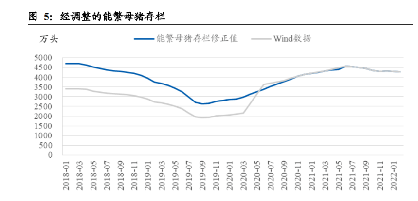 我們重新修正了數(shù)據(jù),更為接近農(nóng)業(yè)部官方口徑。由于農(nóng)業(yè)農(nóng)村部能繁母豬數(shù)據(jù)時(shí) 間跨度更長(zhǎng)且更為高頻,也被市場(chǎng)更為廣泛采用,因此我們以農(nóng)業(yè)農(nóng)村部官方新聞 稿中給出的 2021 年 5 月能繁母豬存欄 4400 萬頭為基準(zhǔn),再根據(jù)每月官方給出的存 欄變化率,對(duì)能繁母豬存欄進(jìn)行了調(diào)整修正。根據(jù)修正后的數(shù)據(jù),2018 年 12 月末 能繁母豬存欄為 4110 萬頭,再根據(jù)同比變化率得出 2017 年末能繁母豬的存欄應(yīng)為 4482 萬頭,與農(nóng)業(yè)部官方數(shù)據(jù) 4470 萬頭基本符合。考慮到數(shù)據(jù)保留位數(shù),我們認(rèn) 為該修正值數(shù)據(jù)序列已經(jīng)接近農(nóng)業(yè)農(nóng)村部官方數(shù)據(jù)。為更真實(shí)地反映生豬養(yǎng)殖行業(yè) 實(shí)際情況,以下我們所采用的能繁母豬存欄數(shù)據(jù)均采用調(diào)整后的修正值。