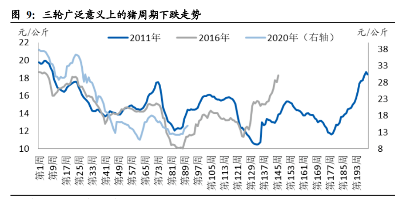 下面我們就談?wù)劄槭裁磿?huì)出現(xiàn)豬價(jià)在楔形區(qū)間內(nèi)周期波動(dòng)。首先,在泛周期上行階 段,產(chǎn)能必定會(huì)在高額利潤(rùn)驅(qū)動(dòng)下而增加,最終導(dǎo)致行業(yè)產(chǎn)能再次過剩,令豬價(jià)重 新進(jìn)入下行周期。但生豬養(yǎng)殖行業(yè)屬于重資產(chǎn)行業(yè),母豬的價(jià)值較高,提前淘汰會(huì) 帶來巨額損失。除了少數(shù)徹底退出的,多數(shù)養(yǎng)殖場(chǎng)應(yīng)對(duì)豬價(jià)下跌的方式還是淘汰低 效母豬、優(yōu)化產(chǎn)能結(jié)構(gòu),因此產(chǎn)能出清的過程很難一步到位。在去產(chǎn)能的過程中, 由于豬肉需求具有明顯季節(jié)性,當(dāng)進(jìn)入春節(jié)、中秋國(guó)慶等傳統(tǒng)消費(fèi)旺季,盡管行業(yè) 總體供給依然過剩,但供需的邊際改善也會(huì)帶動(dòng)豬價(jià)反彈。而對(duì)于任何一家豬場(chǎng)而 言,其自身出欄量對(duì)于全國(guó)豬價(jià)都影響甚微,因此一旦豬價(jià)超過其盈虧平衡線后, 理性做法就是增加自身產(chǎn)能。因此,隨著豬價(jià)不斷上漲,行業(yè)產(chǎn)能增加越來越多,最終導(dǎo)致供需出現(xiàn)逆轉(zhuǎn),令豬價(jià)由漲轉(zhuǎn)跌。如此循環(huán)往復(fù),就使得豬價(jià)在楔形區(qū)間 內(nèi)出現(xiàn)了基本周期波動(dòng)。