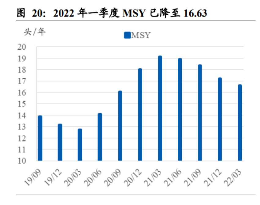 母豬種群優(yōu)化,抵消存欄下降。隨著二元母豬的產(chǎn)能陸續(xù)恢復(fù),三元母豬逐漸被二 元母豬替代,三元母豬占比由 2021 年 5 月的 48%大幅下降至 2022 年 3 月的 12.5%。由于二元母豬的生產(chǎn)效率遠(yuǎn)高于三元母豬,這在很大程度上抵消存欄下降的去產(chǎn)能 效果。我們假設(shè)三元母豬和二元母豬 MSY 分別為為 13 和 17,以此推算整體生豬產(chǎn) 能。從結(jié)果來看,未來半年生豬產(chǎn)能雖有所下滑,但幅度相對(duì)較小,行業(yè)去產(chǎn)能效果并不明顯。