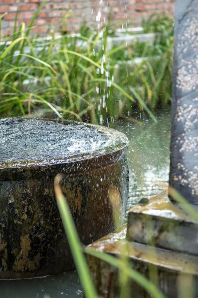 較之其他的普通養豬場,直接排放豬糞便,污染環境不同,這里的豬糞便被提取、烘干、碳化,轉化為優質的肥料,銷售的價格還很高。在這里,豬的尿液和沖洗豬圈的水進入循環凈化池,凈化池里有多種具備水處理能力的植物,依據植物不同的凈化污水的能力分區種植,水凈化后導流至展廳,在展廳與風雨廊之間形成水景。