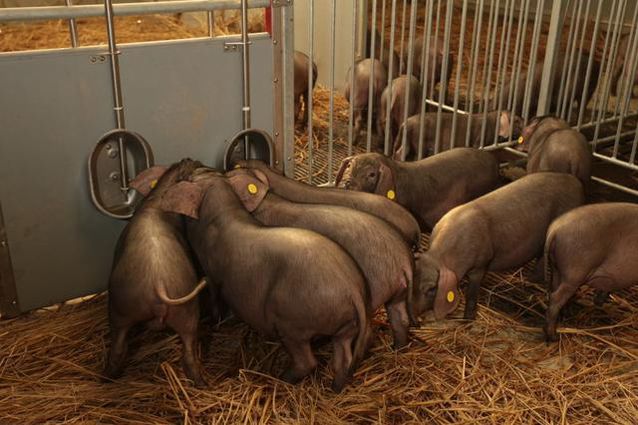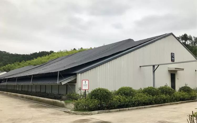 每個豬舍頂棚都采用雙層屋頂結構,屋檐坡度精確到20度,幫助調節不同氣候下的溫度調節,最終實現效果大概就是冬暖夏涼。屋頂每隔6米有一個陽光板,隔熱的同時又不阻擋紫外線,提高黑豬的免疫力。