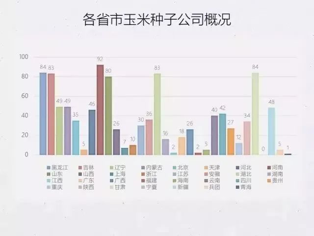 從圖中的玉米種業(yè)公司的總數(shù)來看,除了寧夏沒有玉米種業(yè)公司,其他省份都有玉米種業(yè)公司。