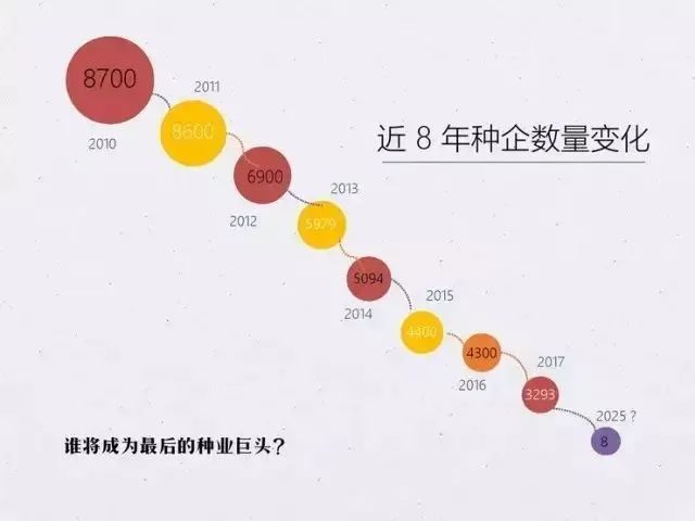 統(tǒng)計發(fā)現(xiàn),種業(yè)公司的數(shù)量在逐年減少,除了 2014 年外每年大約減少 1000 家左右。未來種業(yè)還會剩余多少家呢?這還是個未知數(shù)。