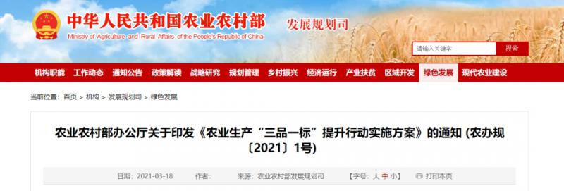 農業農村部辦公廳關于印發《農業生產“三品一標”提升行動實施方案》的通知