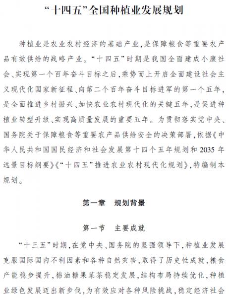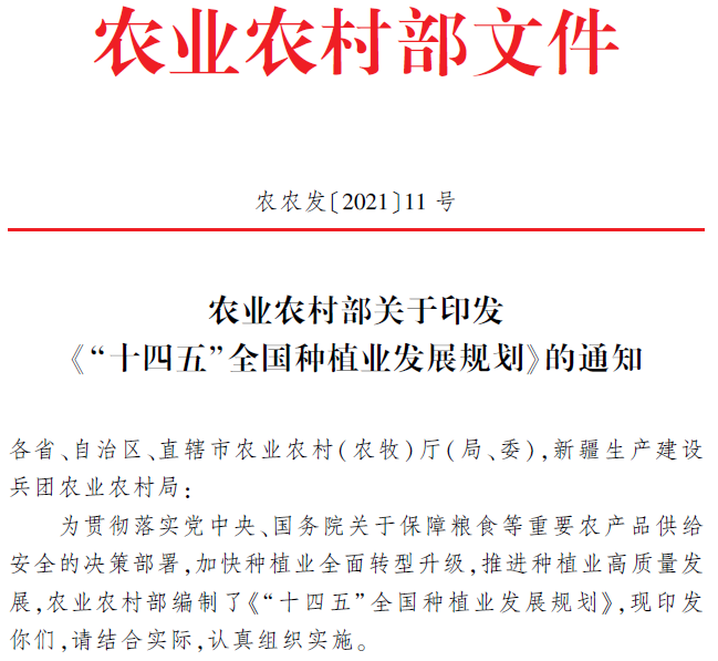 據(jù)農(nóng)業(yè)農(nóng)村部網(wǎng)站消息,為貫徹落實黨中央、國務(wù)院關(guān)于保障糧食等重要農(nóng)產(chǎn)品供給安全的決策部署,加快種植業(yè)全面轉(zhuǎn)型升級,推進種植業(yè)高質(zhì)量發(fā)展,農(nóng)業(yè)農(nóng)村部編制了《“十四五”全國種植業(yè)發(fā)展規(guī)劃》并于近日印發(fā)。其中提到確保總產(chǎn)量保持在1.3萬億斤以上,跨上1.4萬億斤臺階。