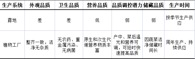 表1-1 LED光源植物工廠生產優勢分析(與露地葉菜生產相比)