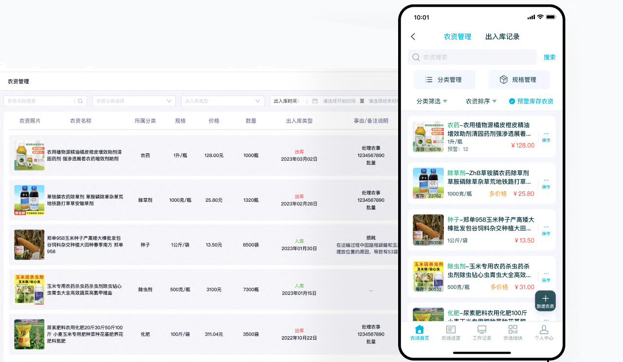 再比如針對固定資產的浪費、農資花銷分散難以對應到具體地塊等問題,“愛耕耘農場版”上線了農資及固定資產管理功能,支持對生產過程中采購或使用的農資進行分類管理、規格管理、農資出入庫記錄等操作,并將其與農事及生育期進度管理功能關聯,保障資產與農事掛鉤。