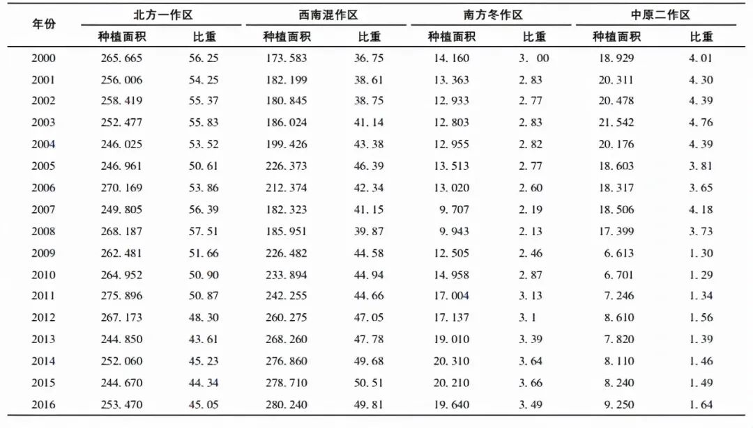 南方冬作區(qū)及中原二作區(qū)種植面積較小,并保持基本穩(wěn)定,南方冬作區(qū)略有上升(表2)。