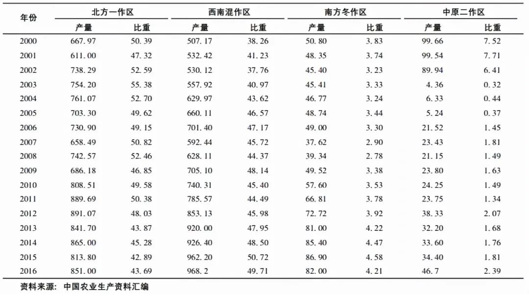 中原二作區(qū)在2000—2005年間產(chǎn)量大幅下降,隨后略有上升,但占全國總產(chǎn)量的比重很小,基本穩(wěn)定在1.6%左右(表1)。