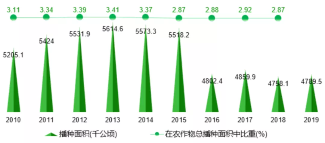 圖1:我國馬鈴薯播種面積與在農(nóng)作物總播種面積中占比走勢(shì)