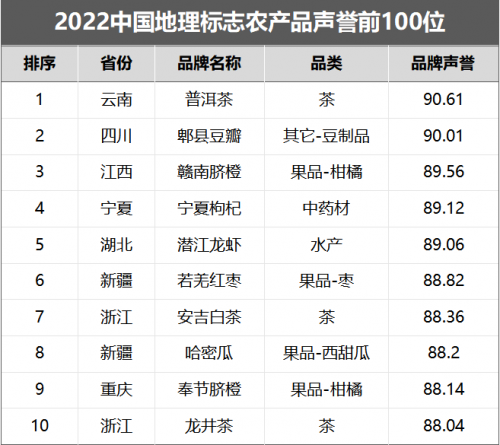 近日,《2022中國地理標志農(nóng)產(chǎn)品品牌聲譽評價報告》發(fā)布,普洱茶以90.61的品牌聲譽值,位居2022中國地理標志農(nóng)產(chǎn)品品牌聲譽排行榜榜首。據(jù)悉,獲得本次評價的這1568個地標品牌遍布全國31個省(自治區(qū)、直轄市),品類覆蓋畜牧、水產(chǎn)、茶葉、果品、糧油、蔬菜(含食用菌)、中藥材以及花卉、香料、副食品等其他特色農(nóng)產(chǎn)品,其中,茶葉類地標品牌共計35個,數(shù)量占比最多。
